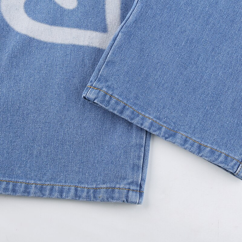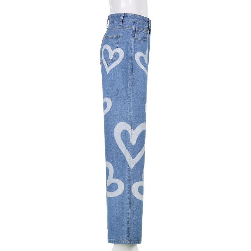 High Waist Women's Jeans Y2k Heart Print Jeans Women's Loose Wide Leg Pants Street Women's Jeans Casual Denim Cotton Pants Women