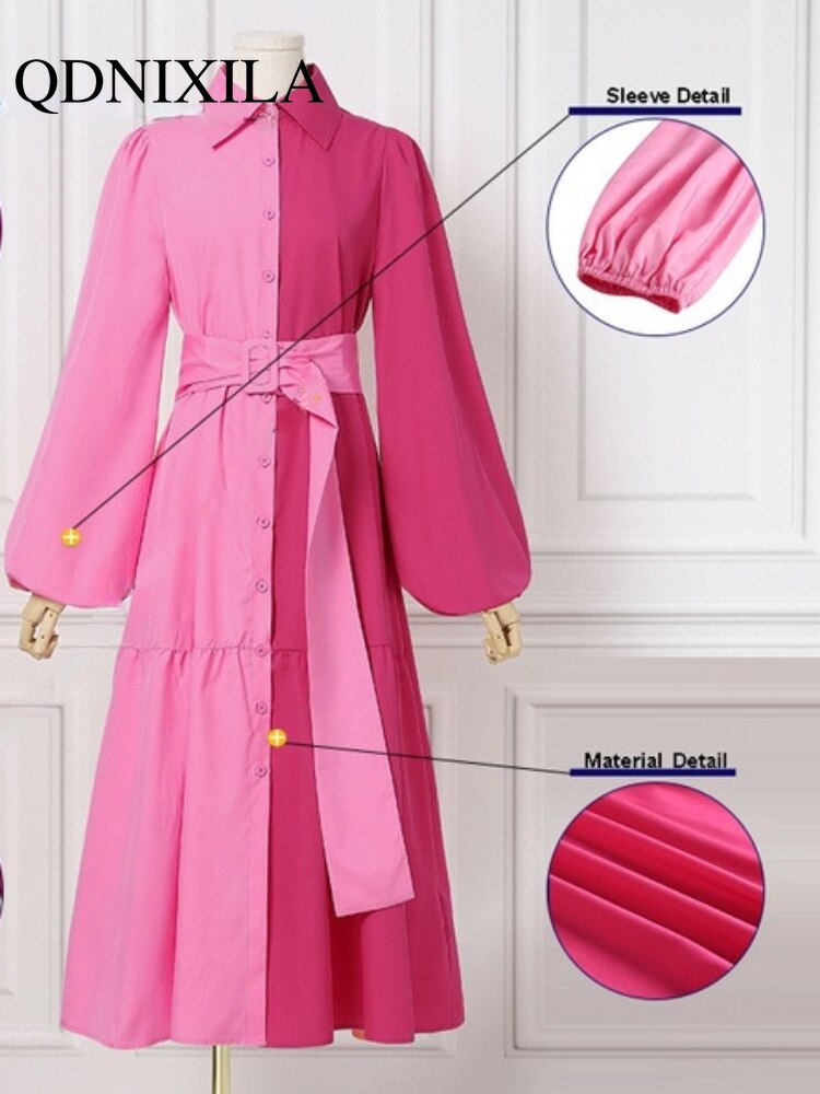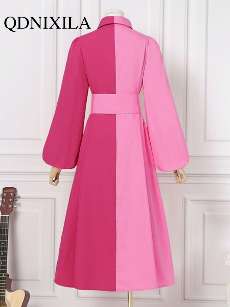 New Elegant Hit Color Dress For Women Lapel Lantern Long Sleeve High Waist Sashes Slim Maxi Dresses Females Spring Fashion Style