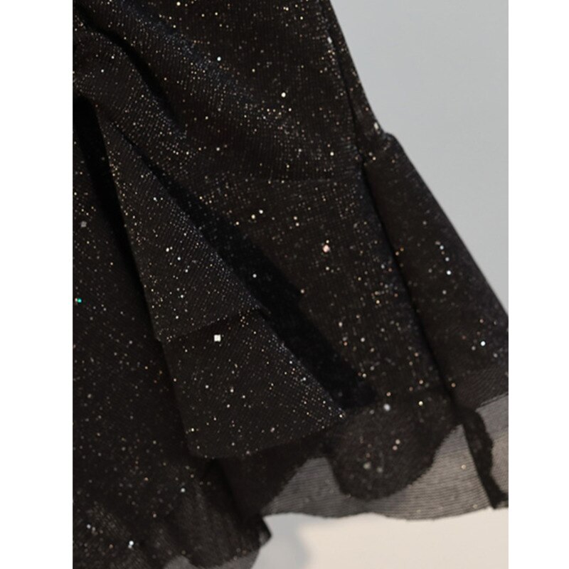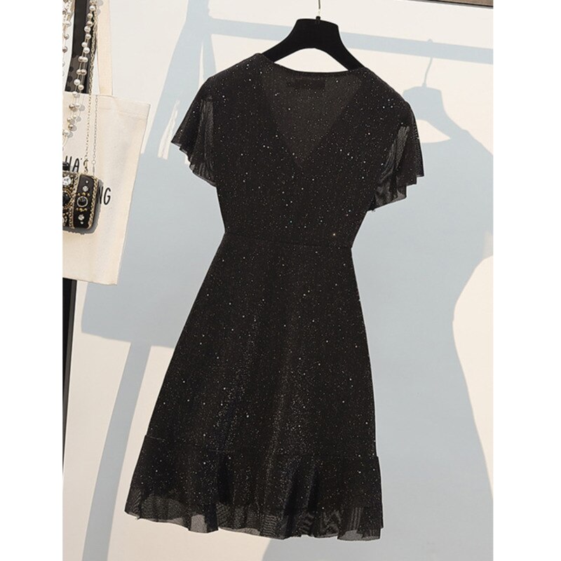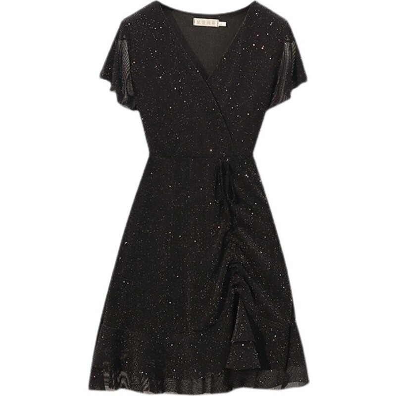 Ladies French Vintage Elegant Sequin V-neck Sexy Dress Short Sleeve Irregular High Waist Temperament Party Ladies Summer Dresses
