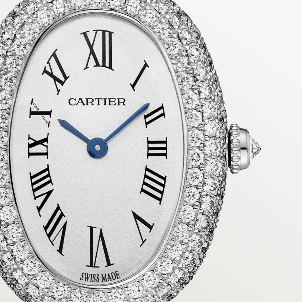 BAGNOIRE DE CARTIER, SMALL MODEL, QUARTZ MOVEMENT. 750/1000 rhodium-plated white gold case, crown and bracelet set with 1,026 brilliant-cut round diamonds weighing a total of 6.39 carats. Bead-shaped crown, silver-plated dial, sword-shaped blued steel hands, synthetic sapphire crystal finish. Length: 31.4 mm, width: 23.1 mm, thickness: 7.6 mm. Living water resistance depth 3 bar (about 30 meters/100 feet).