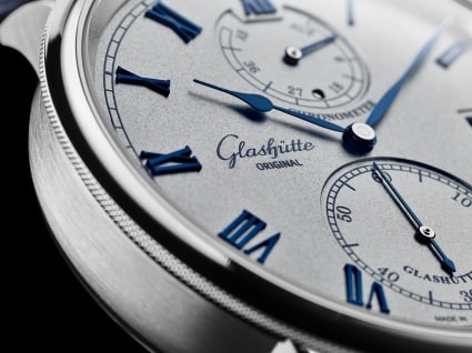Dial material brass; frosted silver plated, electroplated gray, solid gold with blue coating, inlaid Roman numerals, orbital scale ring, blue printed fonts; blue steel hands