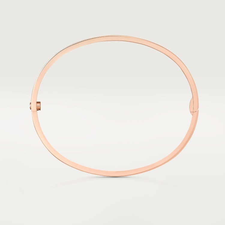 #LOVE# bracelet, small version, 750‰ rose gold, set with 10 round brilliant-cut diamonds, total weight 0.21 carats. Paired with a screwdriver. Width: 3.65 mm (applicable size: 17). Cartier's iconic #LOVE# bracelet has been a symbol of endless love since its introduction in 1969. The screw pattern and the famous locking technique are veritable examples of timeless design, while the oval shape fits the wrist for a comfortable fit. The locking mechanism consists of a functional screw and a hinge, located on either side of the bracelet. Each #LOVE# bracelet comes with a matching screwdriver, made specifically for this piece. To determine the #LOVE# bracelet size, measure the wrist circumference. If you prefer to wear it snugly, add 1cm to your wrist circumference; If you prefer a loose fit, add 2cm to your wrist circumference.