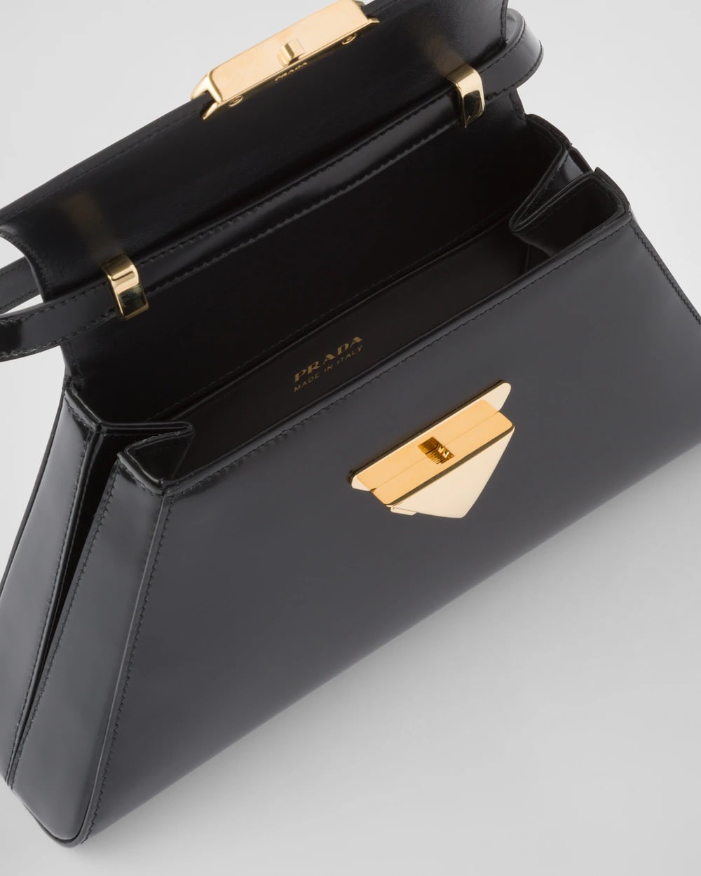In an open dialogue between the past and the present, the Fall/Winter 2023 collection writes the rules of new elegance. Rigid lines with graphic quality reinterpret the vintage reference, introducing innovative design solutions. Crafted from brushed leather, this tote is the label's signature material, and its sleek geometric silhouette inspires refined gestures. The triangle logo is transformed into delicate details, embellishing and closing accessories, cementing the connection between tradition and modernity.