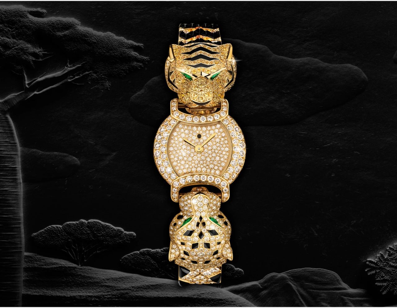 Watches with dials showcasing shagreen-set diamonds, bitten on one side by a panther, and on the other by a tiger, the heads of which are movable.